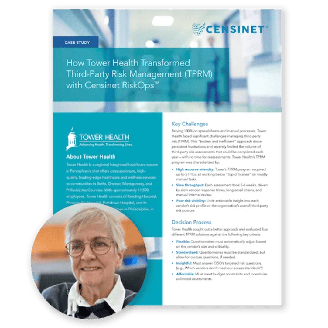 Learn how Terry Grogan, CISO of Tower Health, boosted TPRM productivity by 400% and reduced average assessment completion times down to one week with Censinet RiskOps™